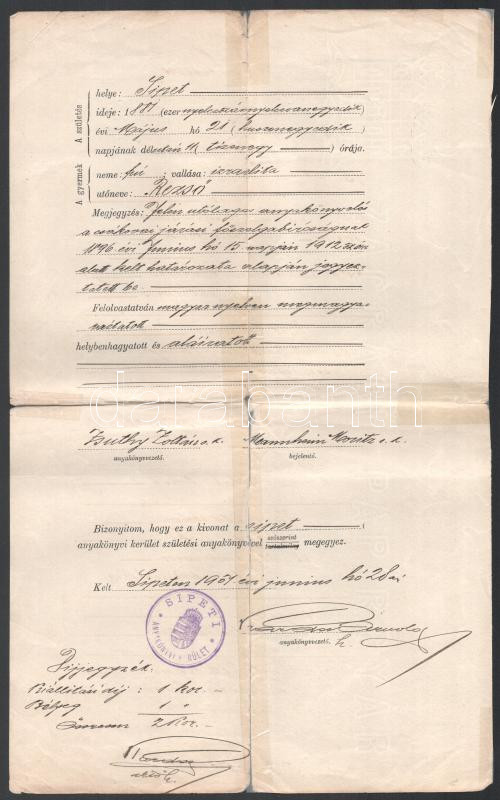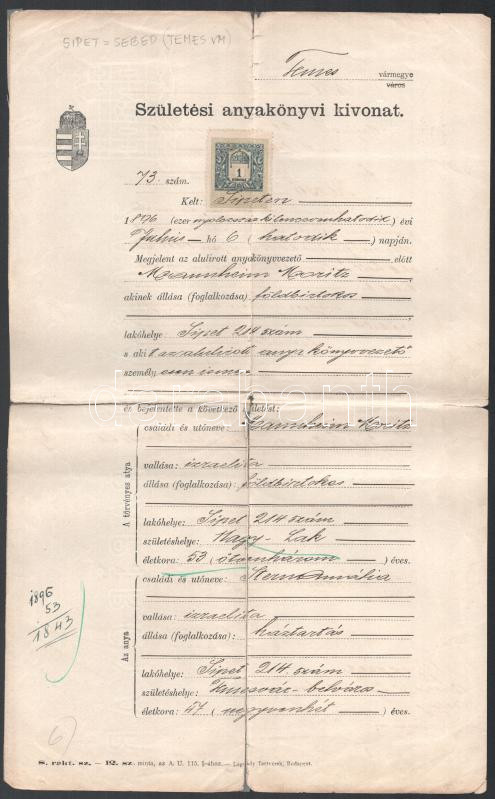 1907 Sipet, Temes vármegye, születési anyakönyvi kivonat, ragasztott https://www.darabanth.com/de/471-Fernauktion/471.0/Kunst-Dokumente-andere-Sammelgebiete/Judaica~1000004/1907-Sipet-Temes-varmegye-szuletesi-anyakonyvi-kivonat-ragasztott~II3187030