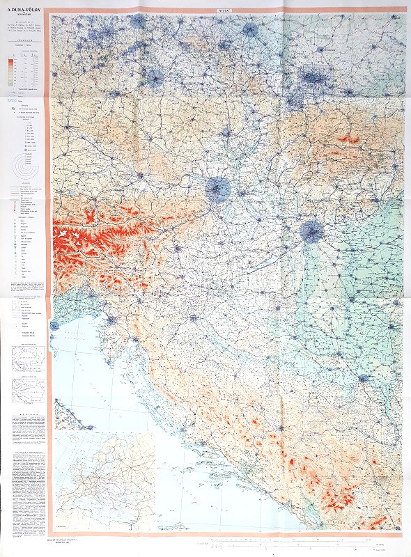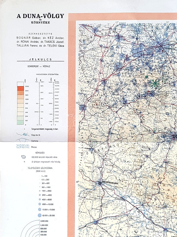 A Duna-völgy és környéke. Nyugati és keleti rész. Szerkesztette: Bognár Gábor, Kéz Andor, Rónai András, Takács József, Tallián Ferenc és Teleki Géza. Mérték: 1:1,000,000. (1947) Budapest, 1947. Magyar Földrajzi Intézet Rt. Színes térkép, két térképszelvényen, méretük egységesen: 1045x710 mm egy 1140x840 mm méretű térképlapon, a teljes térkép mérete: 1140x1680 mm. Színes térképünk a Duna-völgy csaknem teljességét ábrázolja, a környező vidékekkel együtt. Az országhatárok feltüntetése nélkül készült térkép a domborzati, vízrajzi, település-, vasút- és közúthálózaton kívül feltünteti a jelentősebb ásványkincseket és vezetékeket is; a településeket 1930-as lélekszámuk alapján veszi fel, a bányászati erőforrásokat, energiahordozókat az 1935-ös termelési adatok alapján. Térképünk államnyelvek szerint nevezi meg a településeket, hegy- és vízrajzi részleteket, kivételt csak ott tesz, ahol komoly hagyományok és a nemzetiségi csoport jelenléte indokolja az államnyelven megszokottól való megnevezést is, így a Felvidéken, Erdélyben kettős városmegnevezésekkel is találkozhatunk. Térképünk azonos méretű nyugati és keleti térképszelvényből áll össze, az ábrázolt térség középpontjában a Kárpát-medence, a térség északi határát a Weimar-Jena-Chemnitz-Drezda-Boroszló-Radom-Kijev-vonal jelöli ki, keleti határán Kijev, Odessza, Konstanca, Várna, Burgasz városok sorakoznak, délen Burgasz, Plovdiv, Skopje és Ancona, nyugati szélén pedig Ancona, Velence, Regensburg, Bayreuth és Weimar. A nyugati térképszelvény bal alsó sarkában, melléktérképen Európa térképe. Jó állapotú lapok, hajtogatva.
