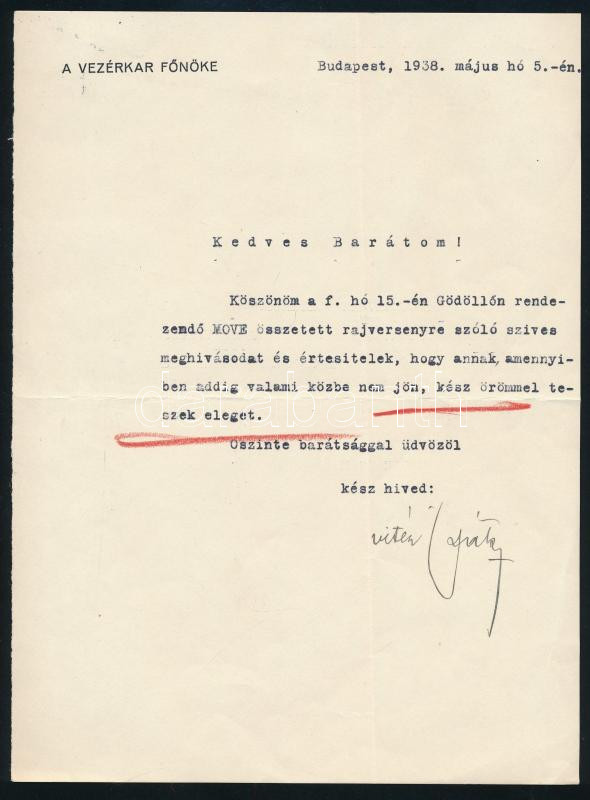 1938 Vitéz nagylaki Rátz Jenő (1882-1952) vezérkari főnök, későbbi honvédelmi miniszter, miniszterelnök-helyettes, felsőházi elnök levele MOVE rajverseny meghívásra válaszolva, egy géppel írt oldal, Rátz Jenő autográf aláírásával, fejléces papíron