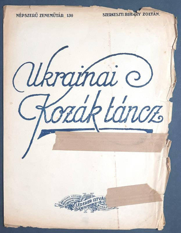 [Kotta] Ukrainai kozák táncz. Danse de cosaque de la l'Ukraine. Budapest, [1917 körül]. Lédeder István Antiquar, Könyv és Zeneműkereskedés [ny. n.] [4] p. Léderer István erzsébetvárosi antikváriuma és zeneműboltja 1913-ban kezdte meg zongora- és nótakottáinak kiadását, eleinte 30 filléres áron, a sorozat 1918-ban már a 145. számnál tartott. Folyóirathirdetéseiben tételünket így reklámozta a kiadó: ,,Szövege nincs, de mint muzsika -elsőrangú tánc!". A hátsó borítón a megjelentetett zeneművek listája, emlékezetes marketingstratégiai megjegyzéssel: ,,Küldje be ismerősei címét, akik muzsikálnak, a fáradságért egy szép kottát küldök ingyen ajándékul". A címoldalon javítások. (Népszerű zeneműtár, 130. szám.) Fűzve, enyhén sérült lapokkal. Ritka.