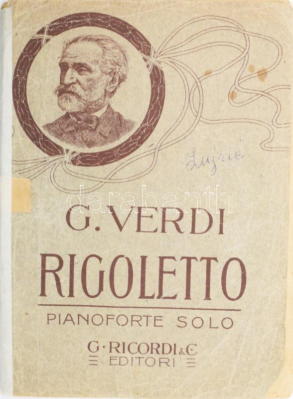 cca 1890-1910 Giuseppe Verdi: Rigoletto. Melodramma in tre atti di Francesco Maria Piave. Milano, é.n., G. Ricordi & C., 2 sztl. lev.+ 103+(9) p. Kiadói papÃrkötés, sérült, hiányos borÃtóval, a gerincen ragasztott, szétváló fűzéssel, több lap kijár.