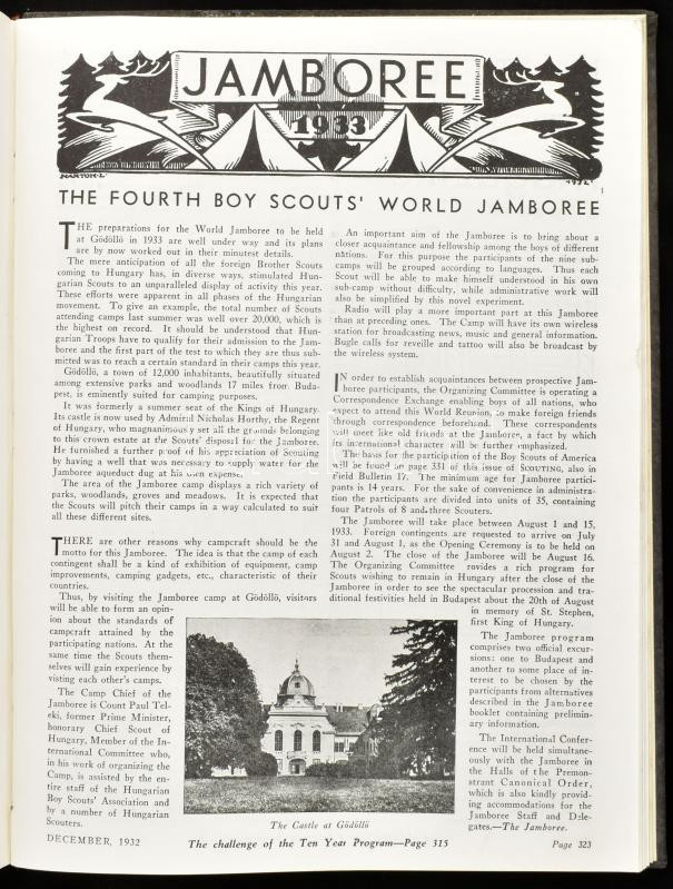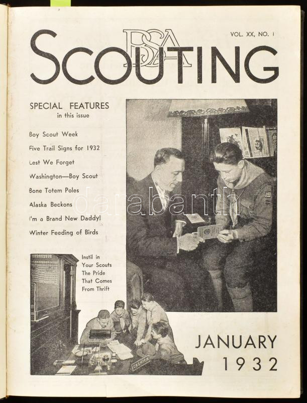 1932 Scouting Vol. XX, No. 1-11. January-December 1932. / Amerikai cserkészeti magazin teljes évfolyama, 1932. január-december. Fekete-fehér képekkel illusztrálva, angol nyelven. Benne az 1933-as gödöllői Jamboree-ről szóló írással. Egészvászon-kötésben.