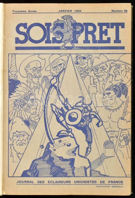 1934 Sois Pret c. francia cserkészeti folyóirat teljes évfolyama, 1934. január-december. Fekete-fehér képekkel, reklámokkal. Félvászon-kötésben, kissé sérült, foltos borítóval.