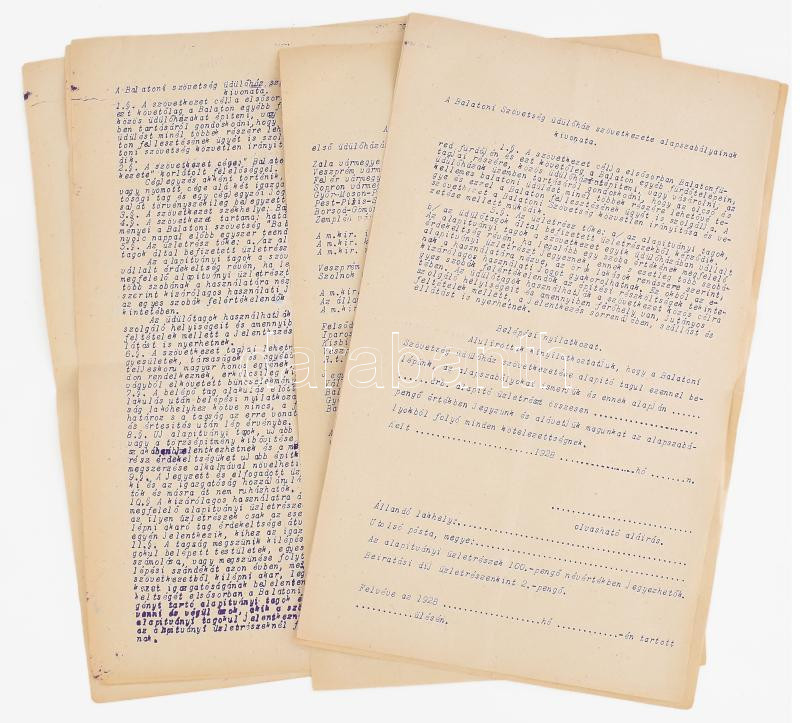 1928 A Balatoni szövetség üdülőház szövetkezete alapszabályainak kivon... https://www.darabanth.com/de/471-Fernauktion/471.0/Kunst-Dokumente-andere-Sammelgebiete/Schiffe-Plattensee~1000007/1928-A-Balatoni-szovetseg-udulohaz-szovetkezete-alapszabalyainak-kivonata-6-gepelt-oldal~II3145964