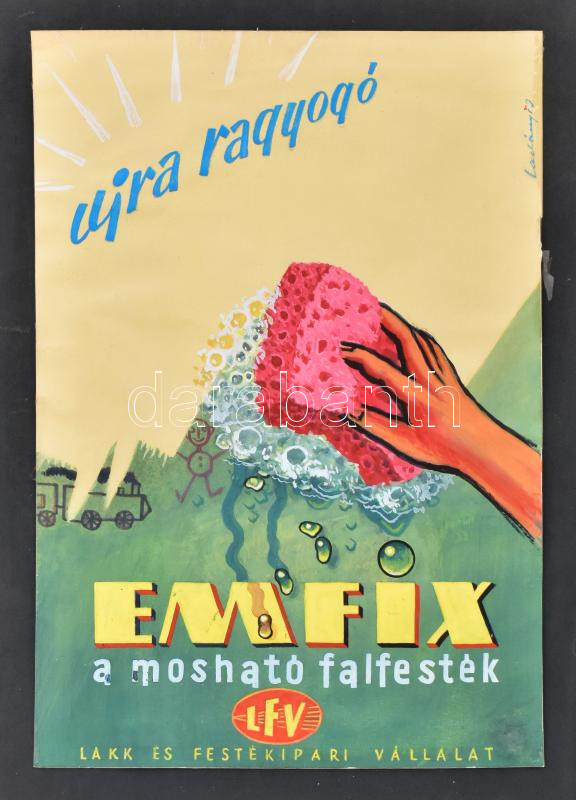 Ladányi József, működött a XX. sz. közepén: Emfix, a mosható felfesték (reklám- vagy plakátterv), 1960 körül. Tempera, papír, jelzett, papírra kasírozva, szélein kissé sérült, 20,5x14 cm.