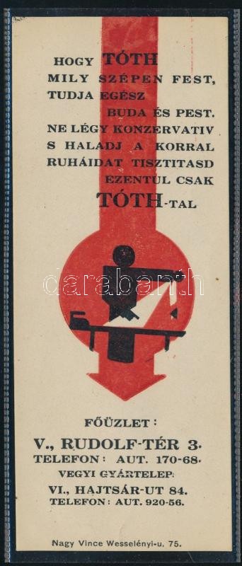 Tóth festő, ruhatisztító üzlete Budapest számolócédula. https://www.darabanth.com/de/471-Fernauktion/471.0/Kunst-Dokumente-andere-Sammelgebiete/Werbungen~1000006/Toth-festo-ruhatisztito-uzlete-Budapest-szamolocedula~II3190299