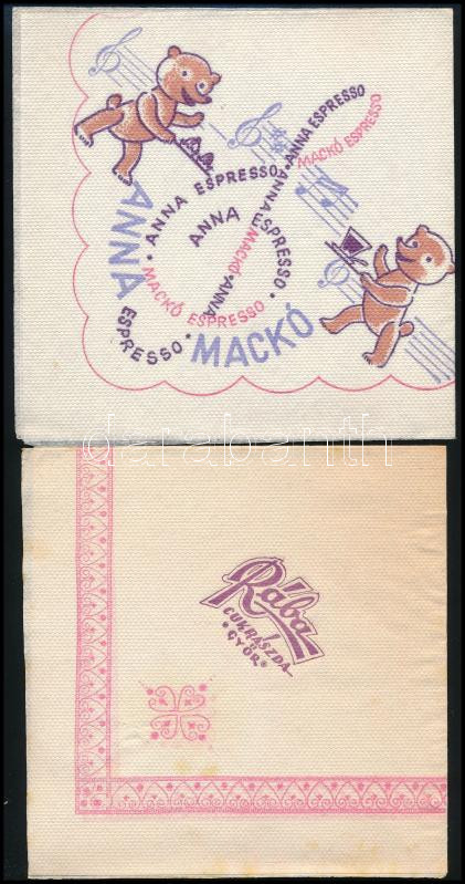 cca 1960 Rába Cukrászda Győr, Anna és Mackó presszó Bp. 2 db reklámos ... https://www.darabanth.com/de/471-Fernauktion/471.0/Kunst-Dokumente-andere-Sammelgebiete/Werbungen~1000006/cca-1960-Raba-Cukraszda-Gyor-Anna-es-Macko-presszo-Bp-2-db-reklamos-szalveta~II3157860