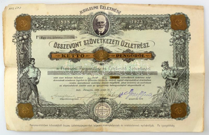 Poroszló 1929. "Poroszlói Fogyasztási és Értékesítő Szövetkezet (Hangy... https://www.darabanth.com/de/471-Fernauktion/471.0/Numismatik/Aktien-und-Tickets~1500006/Poroszlo-1929-Poroszloi-Fogyasztasi-es-Ertekesito-Szovetkezet-Hangya-osszevont-jubileumi~II3191142