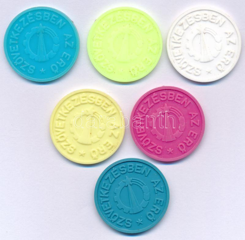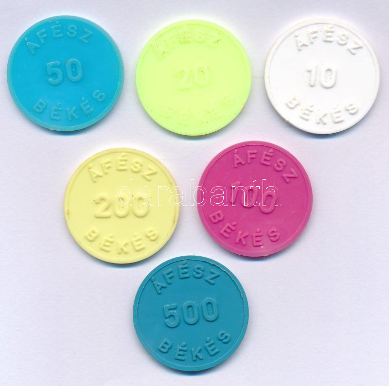 Beschreibung: ~1980. "Szövetkezésben az erő / ÁFÉSZ - Békés", "10", "20", "50", "100", "200" és "500" névértékű műanyag bárca (6xklf) T:AU