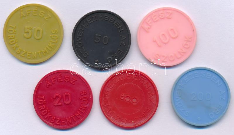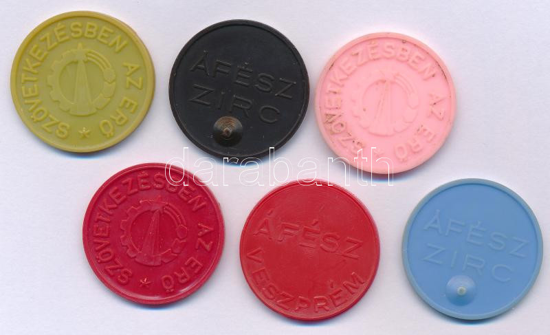 ~1980. "Szövetkezésben az erő / ÁFÉSZ" műanyag bárca (6xklf) T:AU https://www.darabanth.com/de/471-Fernauktion/471.0/Numismatik/Notgeld-aus-Papier-und-Metall~1500007/7E1980-Szovetkezesben-az-ero-AFESZ-muanyag-barca-6xklf-T-AU~II3185429