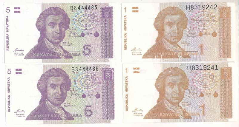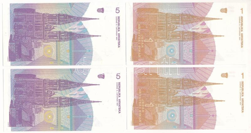Croatia 1991. 1 Dinar (2x) consecutive serials + 5 Dinara (2x) consecutive serials C:UNC