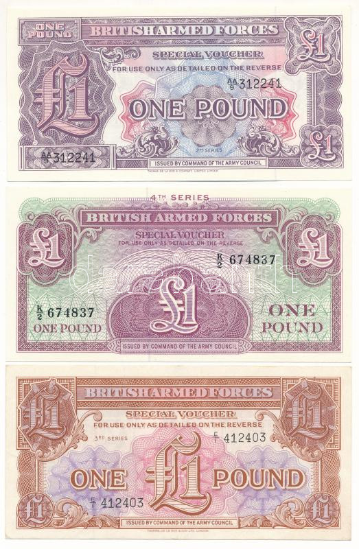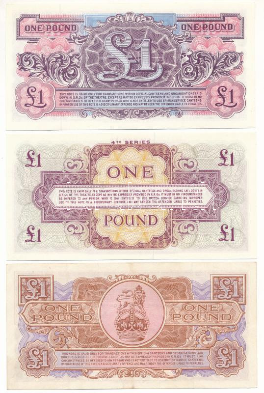 Great Britain / British Armed Forces 1948. 1 Pound "2nd series" with metal security strip + 1956. 1 Pound "3rd series" + 1962. 1 Pound "4th series" C:UNC-F fine paper