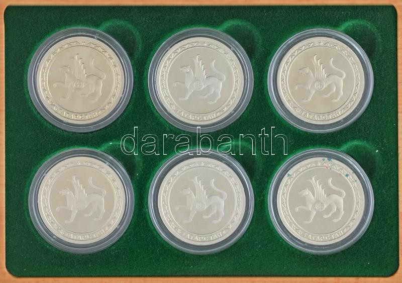 Oroszország / Tatárföld DN Tatárföld nevezetes építményeit ábrázoló, peremen jelzett Ag emlékérmek (6xklf) kapszulában, eredeti fa dísztokban (31-32g/db /0.925/38mm) T:PP közte patina, ujjlenyomat, folt, kis karc Russia / Tatarstan DN 6xdiff hallmarked on the edge Ag medallion set depicting the notable buildings of Tatarstan, in capsules, in their original, decorative wooden case, (31-32g/pc /0.925/38mm) C:PP with patina, fingerprints, spot, small scratch in it