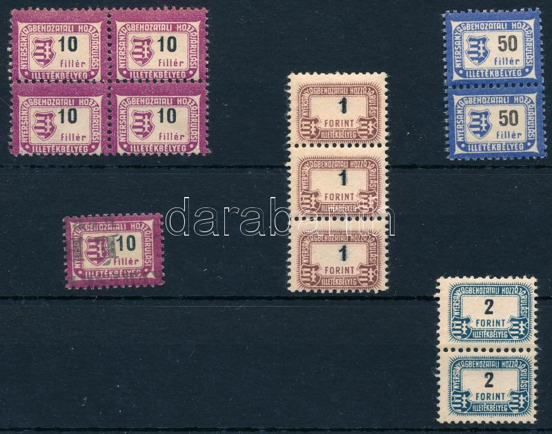 Beschreibung: 12 db Nyersanyagbehozatali hozzájárulási illetékbélyeg, közte összefüggések