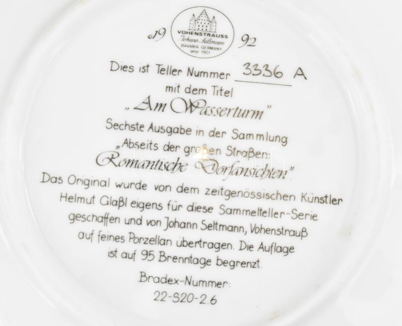 1992, Vohenstrauss dísztál, "A víztoronynáll", jelzett, sors... https://www.darabanth.com/de/471-Fernauktion/471.0/Porzellan-Keramik-Glass/Porzellan~500006/1992-Vohenstrauss-disztal-A-viztoronynall-jelzett-sorszamozott-hibatlan-eredeti-dobozC3~II3096389