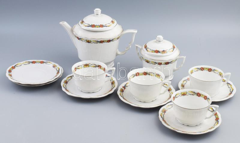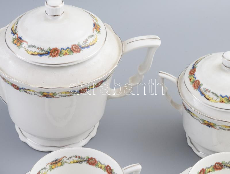 Beschreibung: Zsolnay gyümölcsös virágköteg mintás kávés készlet, 1-1 lepattanással, hiányokkal.