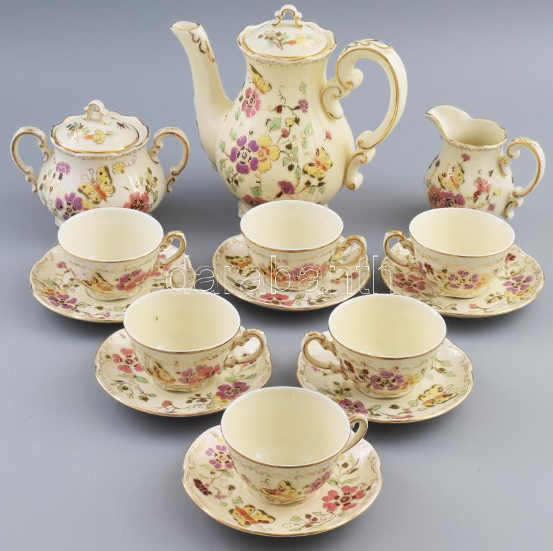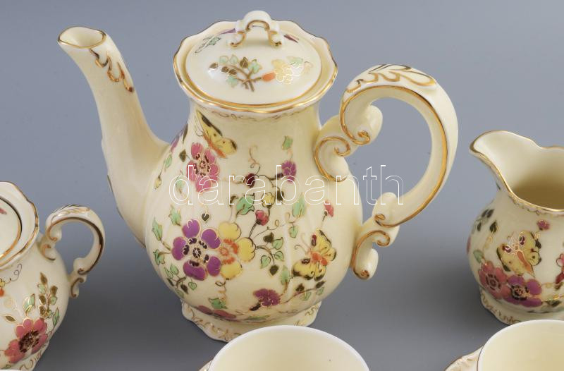 Beschreibung: Zsolnay pillangó mintás mokkás készlet. Hat személyes. Kézzel festett, jelzett, kis kopással.