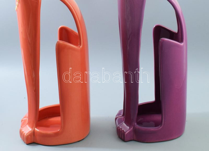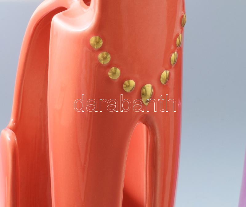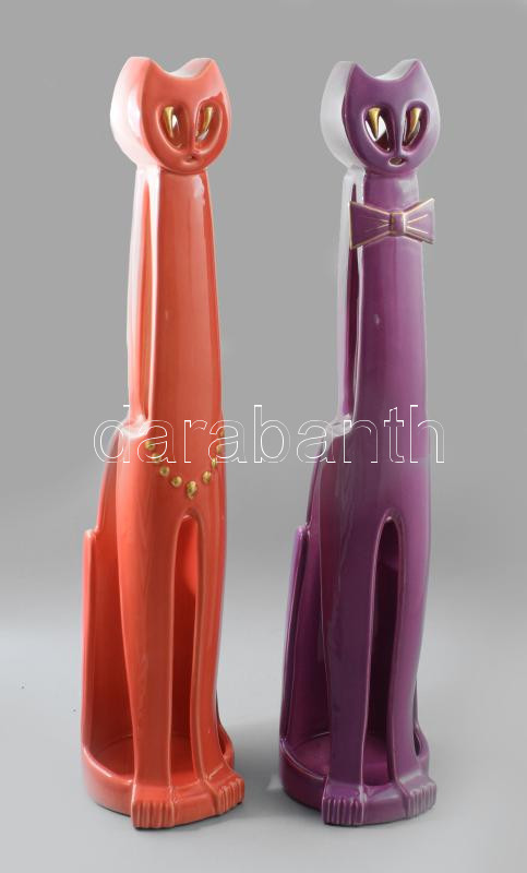 Zsolnay ún. "Csőcica" - nagyméretű macska pár. Terv.: Nádor Judit. Piros és lila mázzal bevont öntött finomfajansz, helyenként 18k arannyal festve. Jelzett, hibátlan, m: 63 cm /// KIZÁRÓLAG SZEMÉLYES ÁTVÉTEL, NEM POSTÁZZUK! / ONLY PERSONAL COLLECTION AT OUR OFFICE!