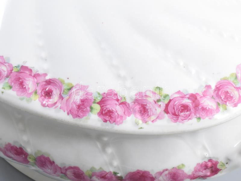 Beschreibung: cca 19. sz. második fele, 3 darabos leveskínáló szett: leveskínáló tál, alátét, sóborskínáló. Rózsamintával díszített, sérüléssel.