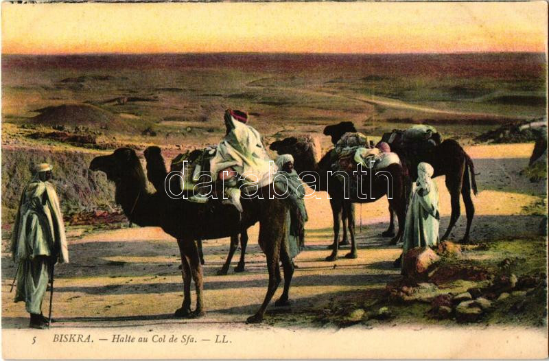 Biskra, Halte au Col de Sfa / camels in the desert, people in traditio... https://www.darabanth.com/de/472-Fernauktion/472.0/Ansichtskarten/Folklore~1500032/Biskra-Halte-au-Col-de-Sfa-camels-in-the-desert-people-in-traditional-dresses-Algerian-folklore~II1330733