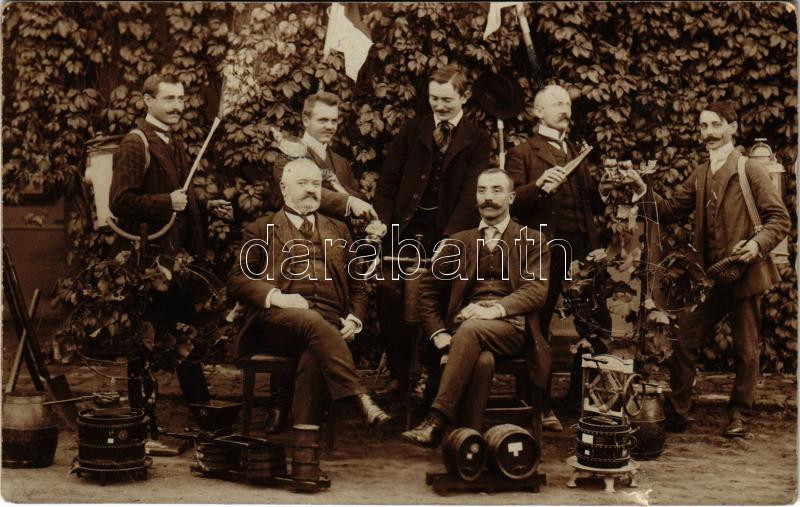 Beschreibung: Szüret, férfiak szőlővel, permetezővel és borral, magyar folklór / Hungarian folklore, grape harvest. photo (b)
