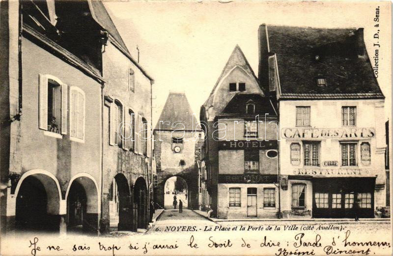 Beschreibung: Noyers, La Place et la Porte de la Ville, Café des Arts, Hotel Rougnat / square with the town gate, coffe shop, hotel