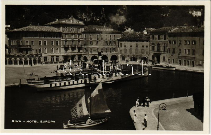 Riva del Garda (Südtirol), Hotel Europa / port, 'Baldo' stea... https://www.darabanth.com/de/472-Fernauktion/472.0/Ansichtskarten/Italien~1500093/Riva-del-Garda-Sudtirol-Hotel-Europa-port-Baldo-steamship-hotel-and-cafe~II3201439