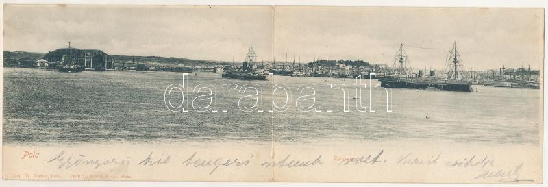 Beschreibung: 1901 Pola, Pula; Panorama. K.u.K. Kriegsmarine, Kriegshafen / osztrák-magyar haditengerészeti kikötő és hajógyár, hadihajók. 2-részes kihajtható panorámalap / Austro-Hungarian navy port and shipyard, battleships. 2-tiled folding panoramacard. Dep. M. Fischer. Phot. C. Sintich & Co. (hajtásnál szakadt / torn at fold)