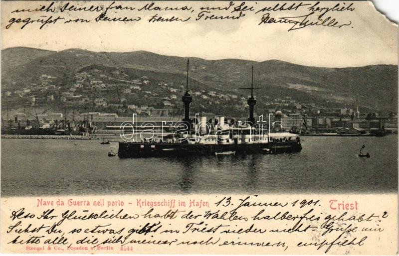 1901 Trieste, Nave da Guerra nell porto / SMS Kaiserin und Königin Maria Theresia osztrák-magyar haditengerészet páncélos cirkáló / K.u.K. Kriegsmarine Kriegsschiff Hafen / Austro-Hungarian Navy SMS Kaiserin und Königin Maria Theresia armored cruiser (EM)