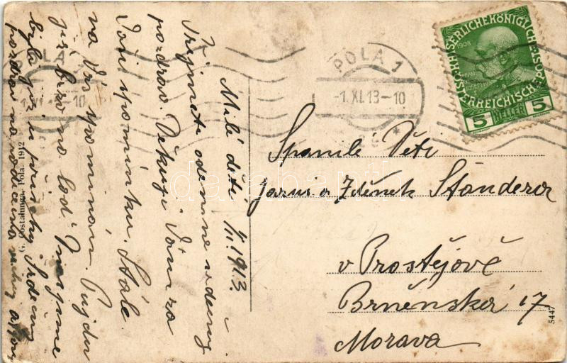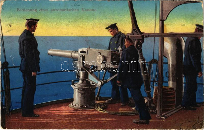 1913 K.u.K. Kriegsmarine, Bedienung einer automatischen Kanone. G. Costalunga, Pola 1912. / Osztrák-magyar haditengerészet automata ágyúja, matrózok gyakorlat közben / Austro-Hungarian Navy mariners, operation of the automatic cannon, Skoda 37 mm C.1900 Vickers (EK)
