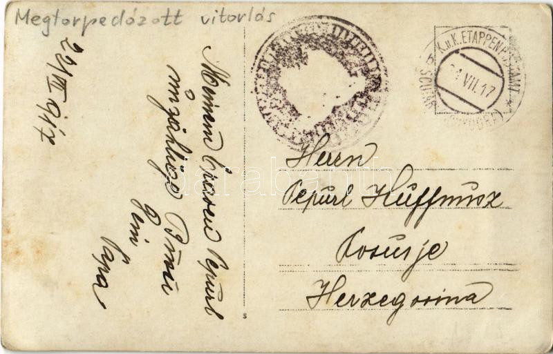 1917 Osztrák-magyar haditengerészet által megtorpedózott vitorlás. Táb... https://www.darabanth.com/de/472-Fernauktion/472.0/Ansichtskarten/Kriegsschiffe~1500037/1917-Osztrak-magyar-haditengereszet-altal-megtorpedozott-vitorlas-Tabori-posta-kepeslap-nega~II2983457
