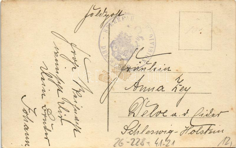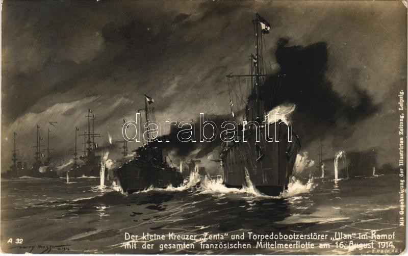 Der kleine Kreuzer "Zenta" und Torpedobootzerstörer "Ulan" im Kampf mit der gesamten französischen Mittelmeerflotte am 16. August 1914. / Osztrák-Magyar Haditengerészet "Zenta" védett cirkálója és az "Ulan" torpedóromboló (Zerstörer) harca a francia mediterrán flottával / WWI Austro-Hungarian Navy art postcard, K.u.K. Kriegsmarine, SMS Zenta protected cruiser and SMS Ulan torpedo destroyer againts the French Mediterranean Fleet s: Harry Heusser (fl)