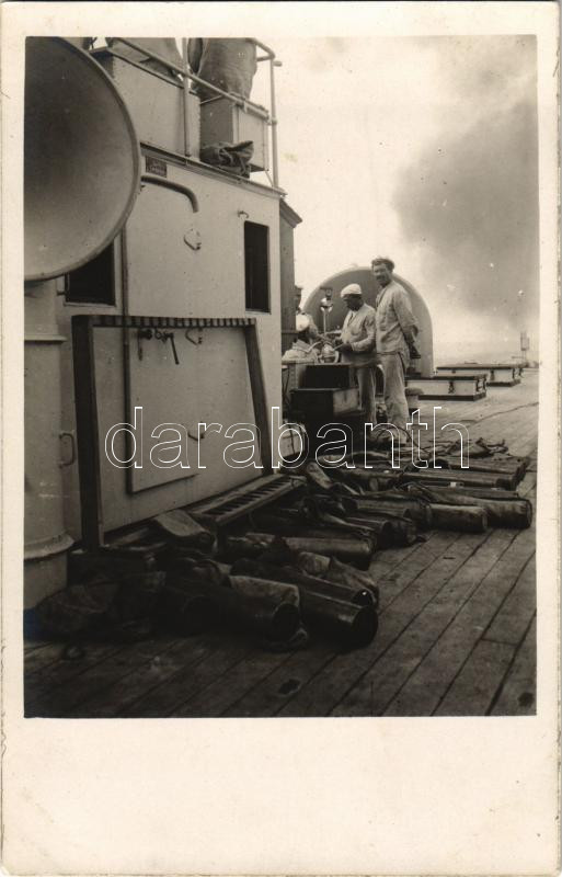 Osztrák-magyar haditengerészeti Zenta-osztályú védett cirkáló matrózai tüzelés után a töltényhüvelyekkel / K.u.K. Kriegsmarine Matrosen / Austro-Hungarian Navy Zenta-class protected cruiser's mariners with casings from fired shells. photo