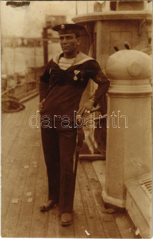 SMS PLANET osztrák-magyar haditengerészeti Planet-osztályú torpedóhajó (őrhajója) matróza kitüntetésekkel és tőrrel az oldalán / K.u.K. Kriegsmarine Matrose / Austro-Hungarian Navy Planet-class torpedo boat's mariner with medals and service dagger. photo (fl)