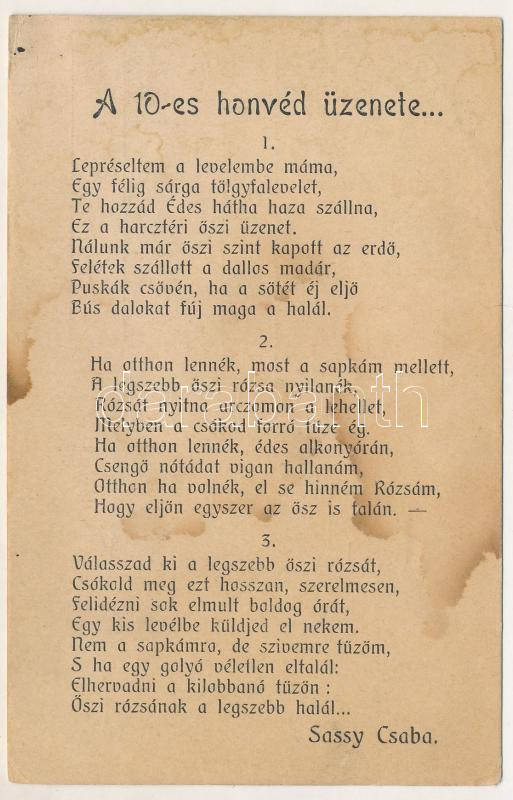 1915 A 10-es honvéd üzenete... Sassy Csaba. Tábori levelezőlap + "... https://www.darabanth.com/de/472-Fernauktion/472.0/Ansichtskarten/Militaria~1500057/1915-A-10-es-honved-uzenete-Sassy-Csaba-Tabori-levelezolap-plus-Tabori-Postahivatal-70-azo~II3194604