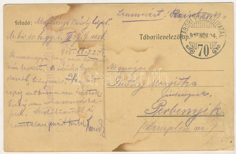 Beschreibung: 1915 A 10-es honvéd üzenete... Sassy Csaba. Tábori levelezőlap + "Tábori Postahivatal 70" (ázott / wet damage)