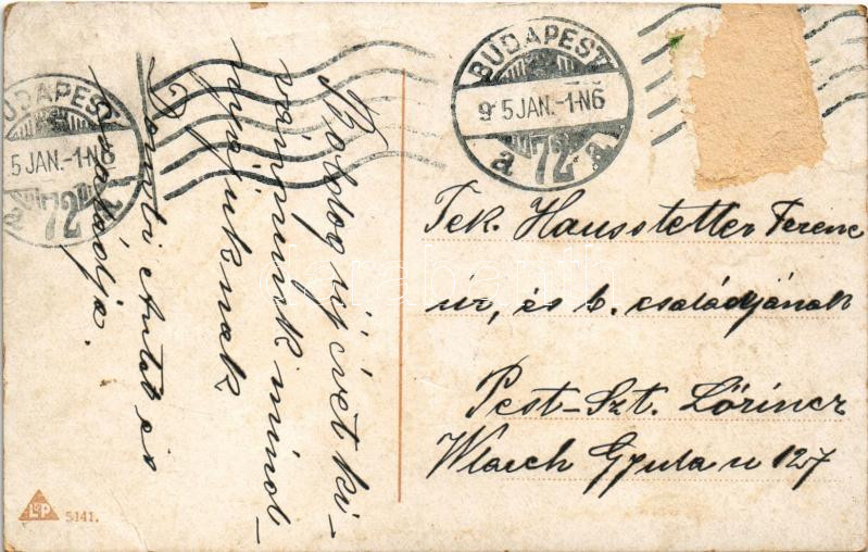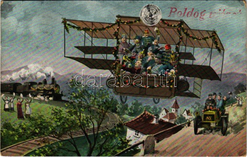 1915 Boldog újévet! Osztrák-magyar katonák repülőgépen, autóban és vonaton / New Year greeting, Austro-Hungarian K.u.k. military, soldiers in aircraft, automobile and train. L&P 5141. (Rb)