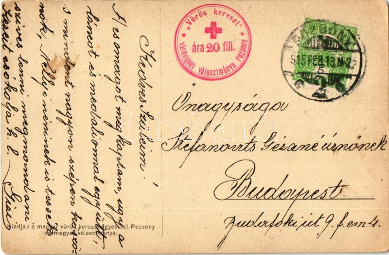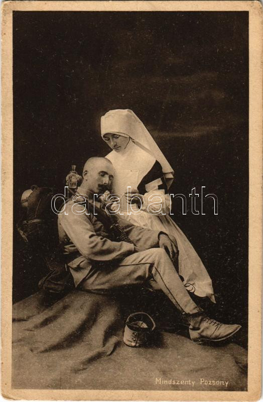 1915 Kiadja a magyar vöröskereszt egyesület Pozsony vármegyei választmánya / WWI Austro-Hungarian K.u.K. military, injured soldier with Red Cross nurse (EK)