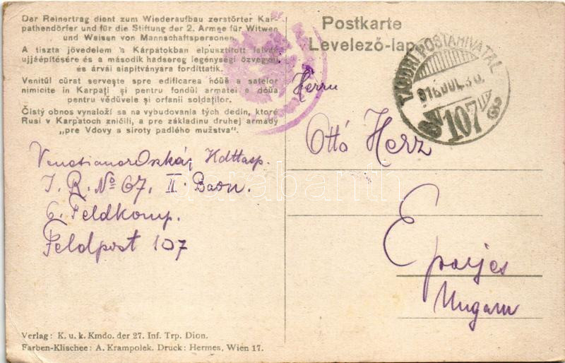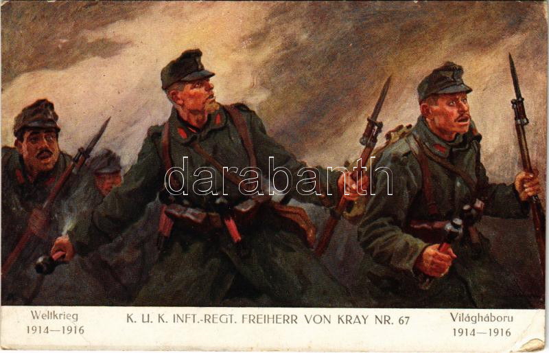 1916 Weltkrieg 1914-1916 - K.u.K. Inft.-Regt. Freiherr von Kray Nr. 67. Verlag K.u.K. Kmdo. der 27. Inf. Trp. Dion. / WWI Austro-Hungarian military art postcard, support fund, infantry regiment s: Hans Larwin (EK)