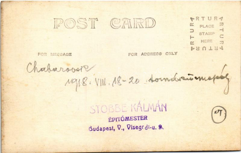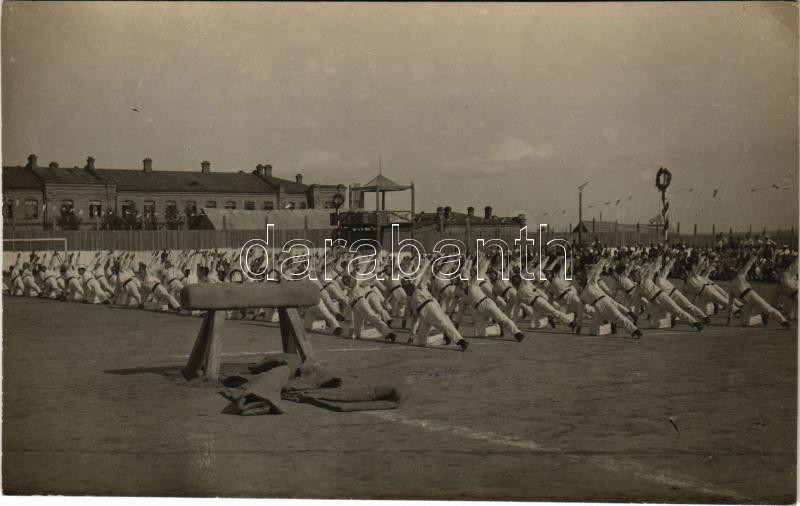 1918 Krasznaja Recska, Rjecska, Krasnaia- Rjetschka (Habarovszk, Khabarovsk); Az ekkor már amerikai fennhatóság alatt álló hadifogoly tábor tornászünnepsége. Fotólap 14x9 cm Hátoldalán Stobbe Kálmán (1883-1936) építőmester, labdarúgó, a magyar válogatott edzője pecsétjével / gymnastics festival of the Japanese-Russian POW (prisoner of war) camp. photo (EK)