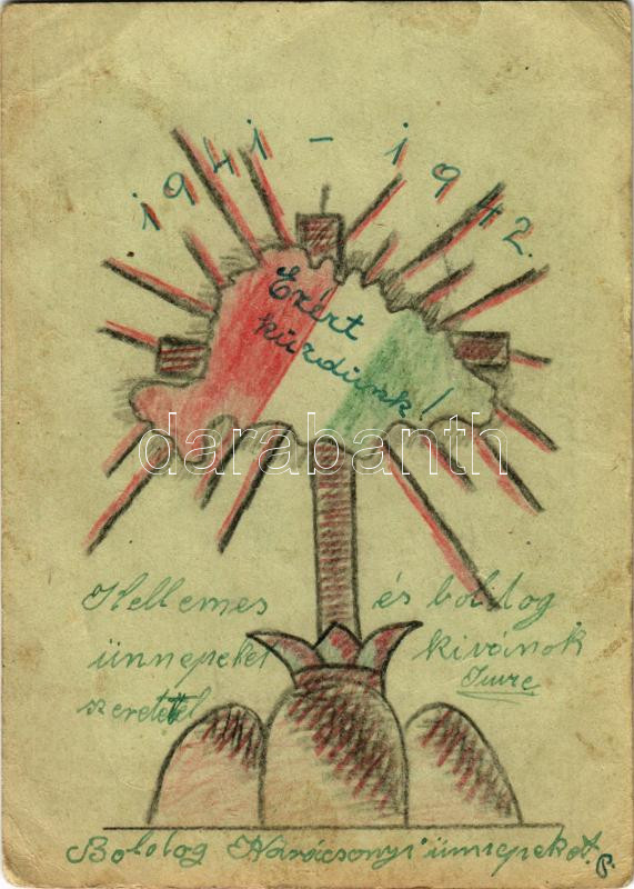 1941 Ezért küzdünk! Második világháborús kézzel rajzolt Tábori Postai Levelezőlap / WWII Hungarian hand-drawn military field postcard, irredenta propaganda (EB)