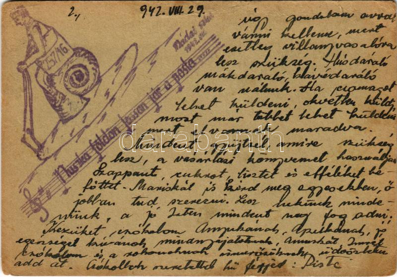1942 Muszkaföldön lassan jár a posta. Második világháborús kézzel rajzolt Tábori Postai Levelezőlap Oroszországból / WWII Hungarian hand-drawn military field postcard from Russia, snail s: Mádai (EM)