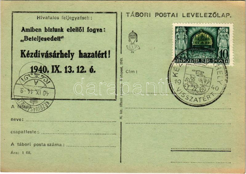 Amiben bíztunk eleitől fogva: Beteljesedett. Kézdivásárhely hazatért! 1940. IX. 13. 12 óra. Tábori Postai Levelezőlap / Hungarian military field postcard with irredenta propaganda, entry of the Hungarian troops to Targu Secuiesc + "1940 Kézdivásárhely visszatért" So. Stpl. (EK)