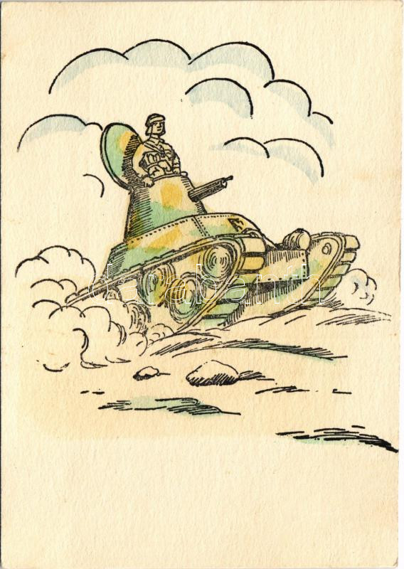 Bevonuláskori művészlap katonával és tankkal. Kiadja a Defhe Aradi Temesi Bánság / WWII entry of the Hungarian troops, soldier with tank. Irredenta art postcard (EB)