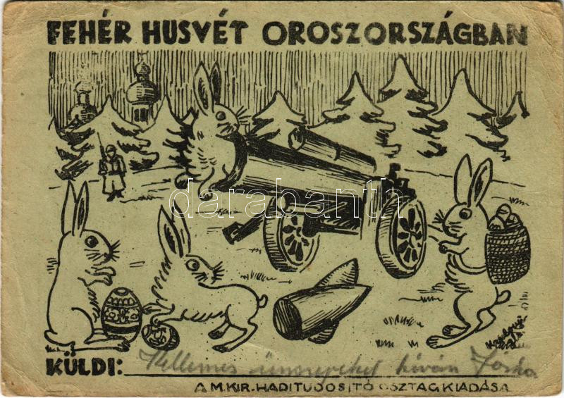 Fehér húsvét Oroszországban. Második világháborús Tábori Postai Levelezőlap. M. kir. haditudósító osztag kiadása / WWII Hungarian military field postcard with Easter greeting from Russia, rabbits (EB)