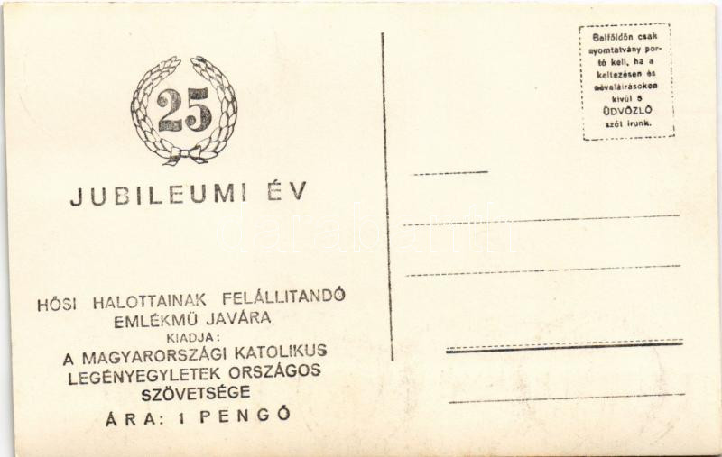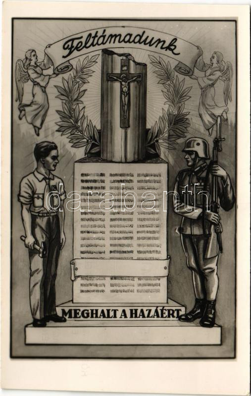 "Feltámadunk! Meghalt a hazáért" - 25. Jubileumi év hősi halottainak felállítandó emlékmű javára. Kiadja a Magyar Katolikus Legényegyletek Országos Szövetsége / WWII Hungarian military, war heroes' monument