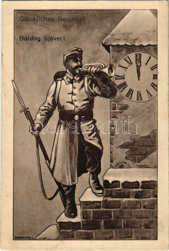 Beschreibung: Glückliches Neujahr! / Boldog Újévet! / WWI Austro-Hungarian K.u.K. military art postcard with New Year greetings s: Bortnyik S. (Rb)