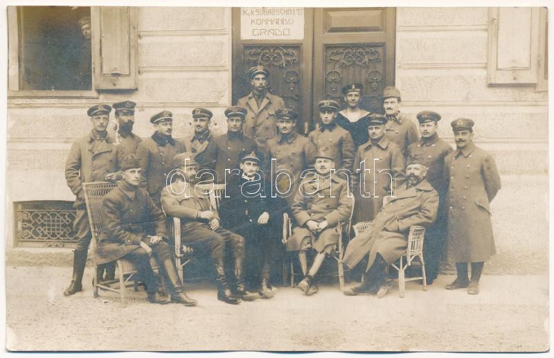 K.u.k. Subabschnitt Kommando Grado / Osztrák-magyar katonák és tisztek csoportképe Gradoban / K.u.k. Austro-Hungarian military soldiers and officers group photo (ázott /wet damage)