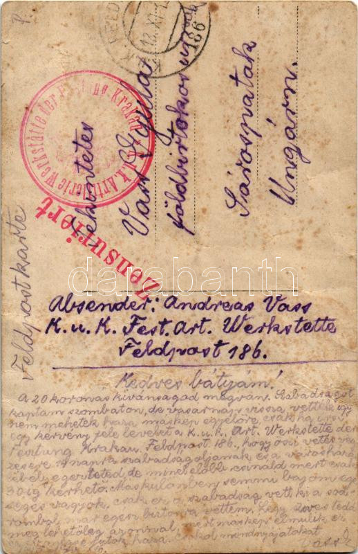 Beschreibung: Osztrák-magyar tüzérség mozsárágyúval / WWI Austro-Hungarian K.u.K. military artillery with mortar. photo + "K.u.K. Artillerie Werkstätte der Festung Krakau" (szakadás / tear)