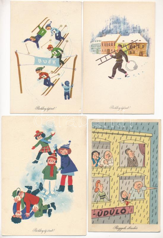 38 db MODERN magyar retro grafikai üdvözlő képeslap. Képzőművészeti Alap: humor és Újév / 38 modern Hungarian retro greeting graphic postcards: humour and New Year